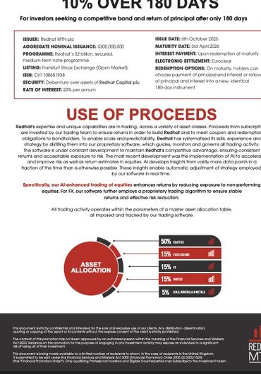 The Redhat 180-Day Bond targets a fixed coupon over a six-month term, giving you a defined date to take funds out or roll into the next 180-day tranche (subject to availability and suitability). For investors managing cash over 6–12 months, it’s a disciplined way to earn income without tying money up for years.